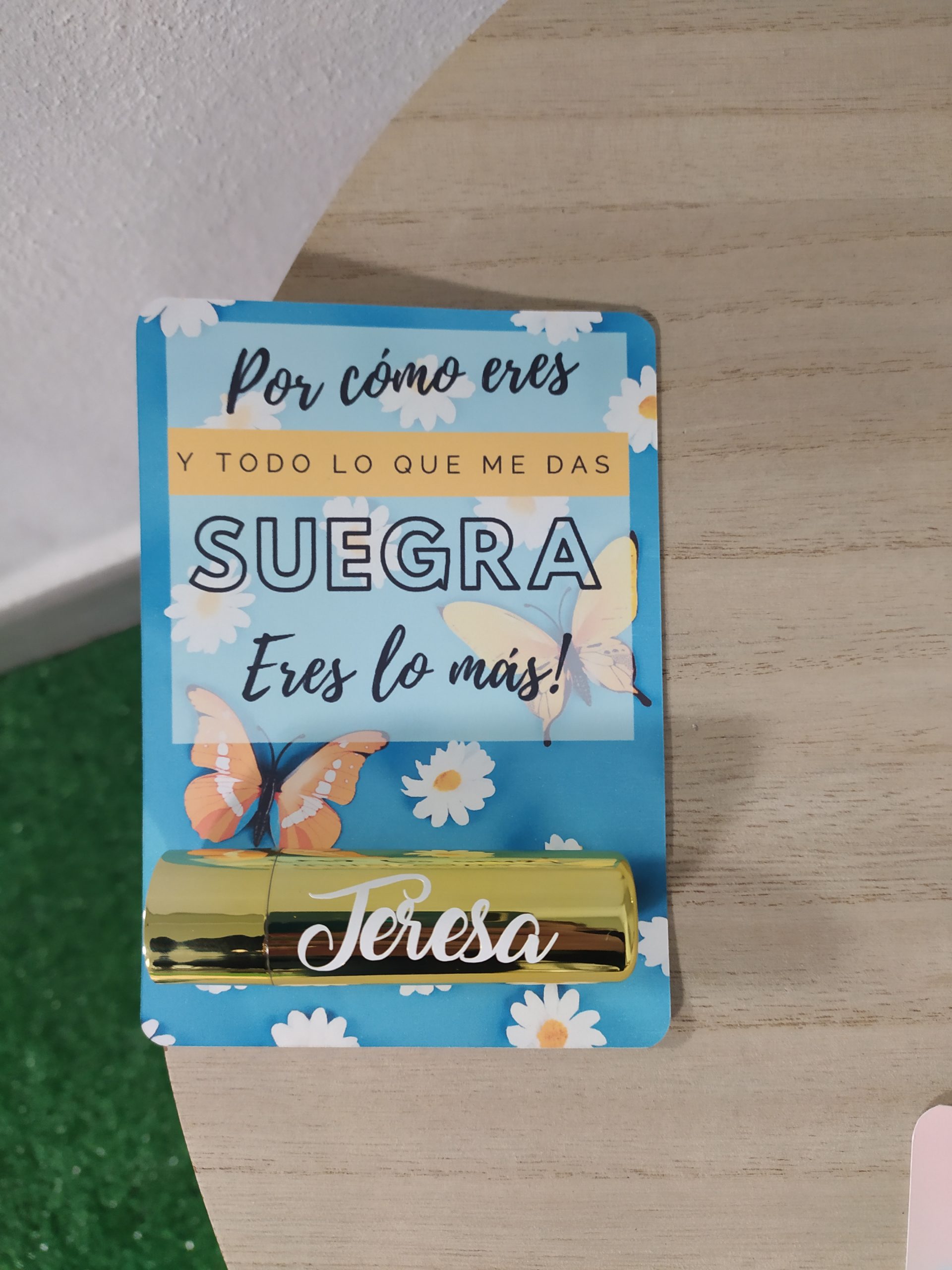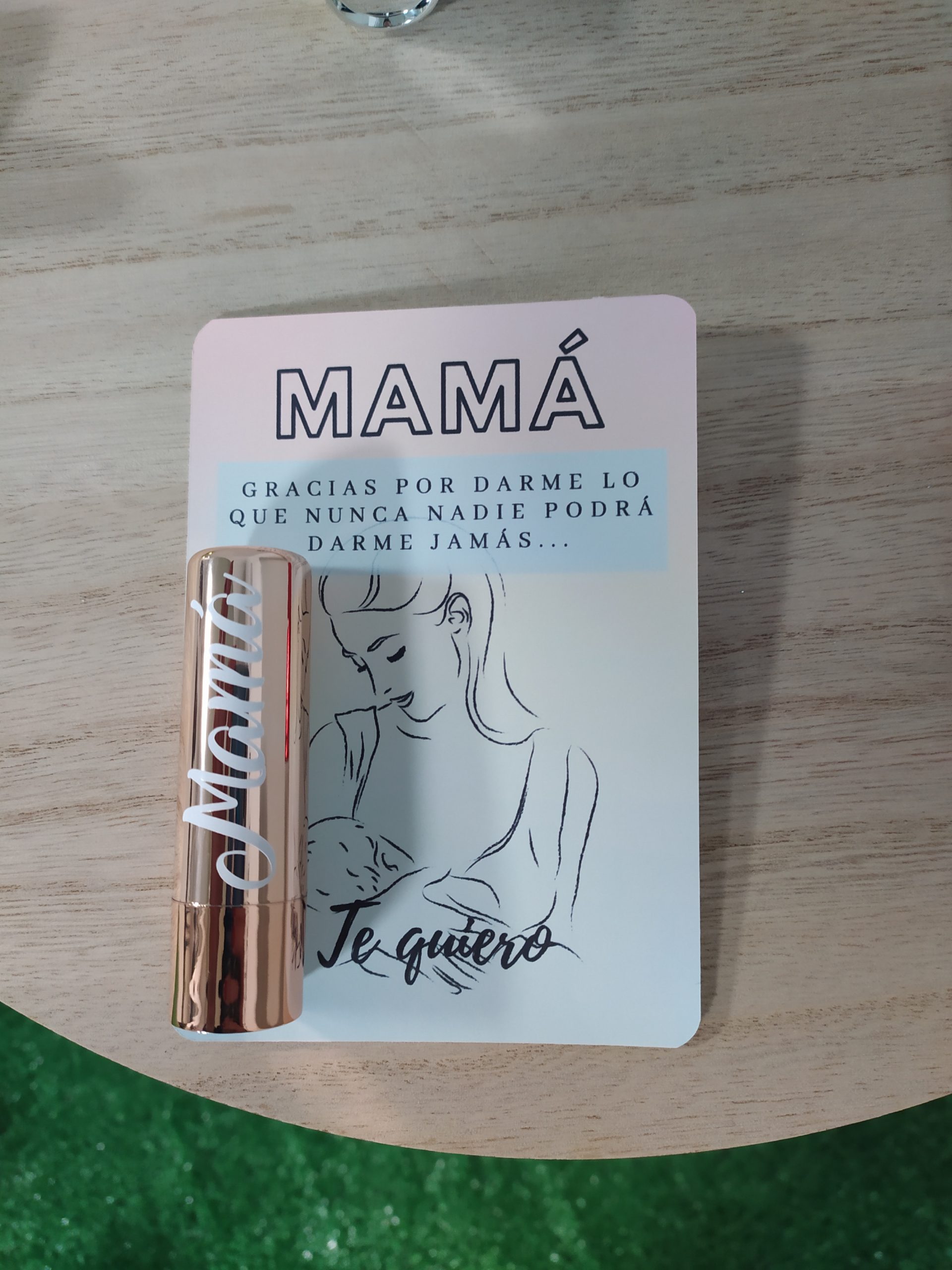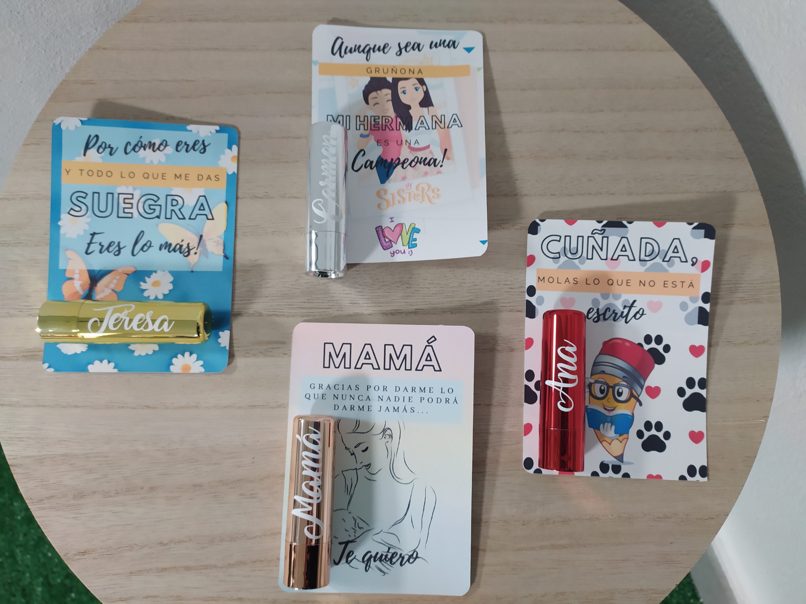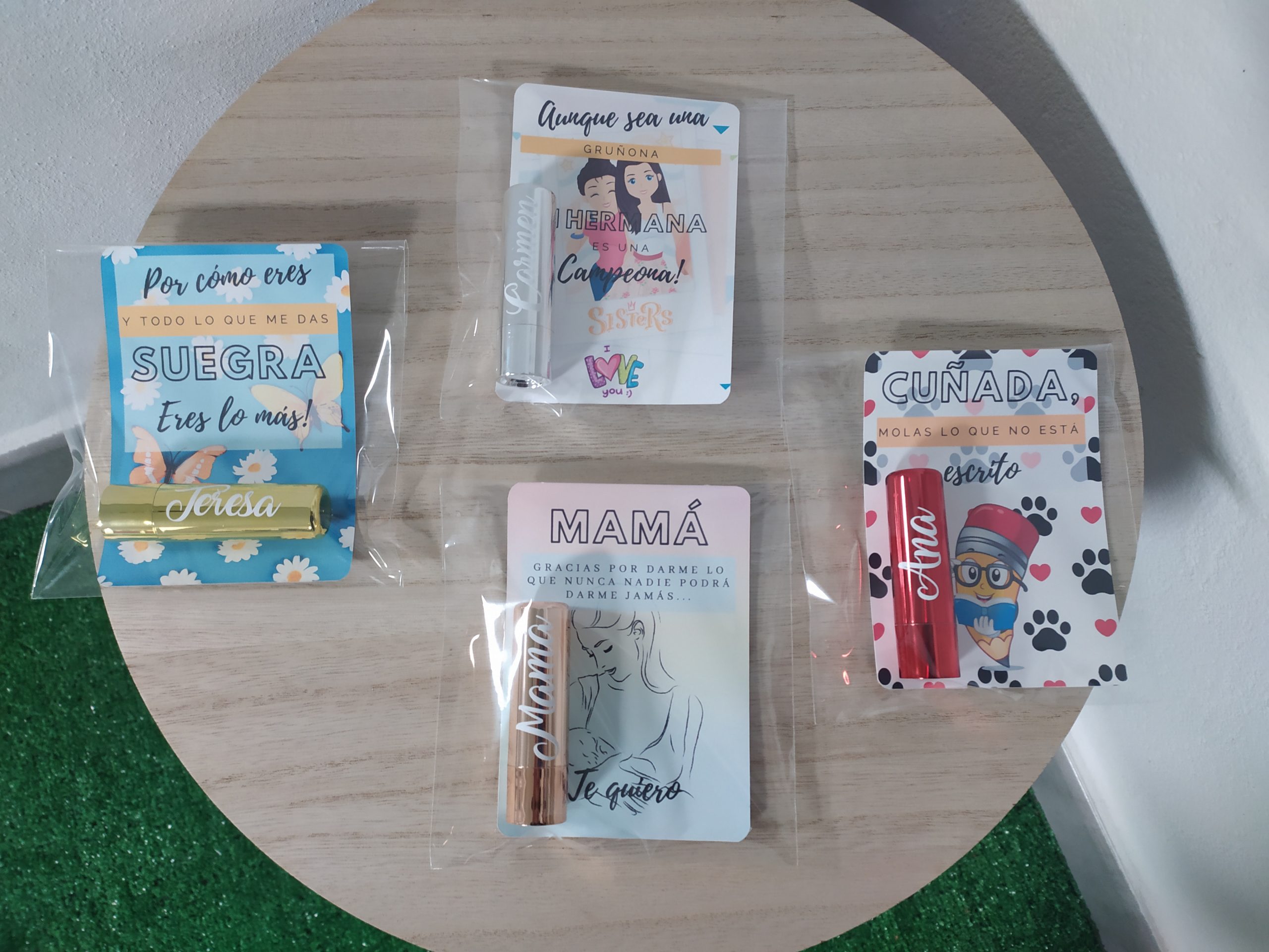 Detalle Bálsamo labial personalizado con nombre y diseño a elegir o personalizado; barra de labios disponible en varios colores: Plata, Oro, Rojo, Azul y Oro Rosa.