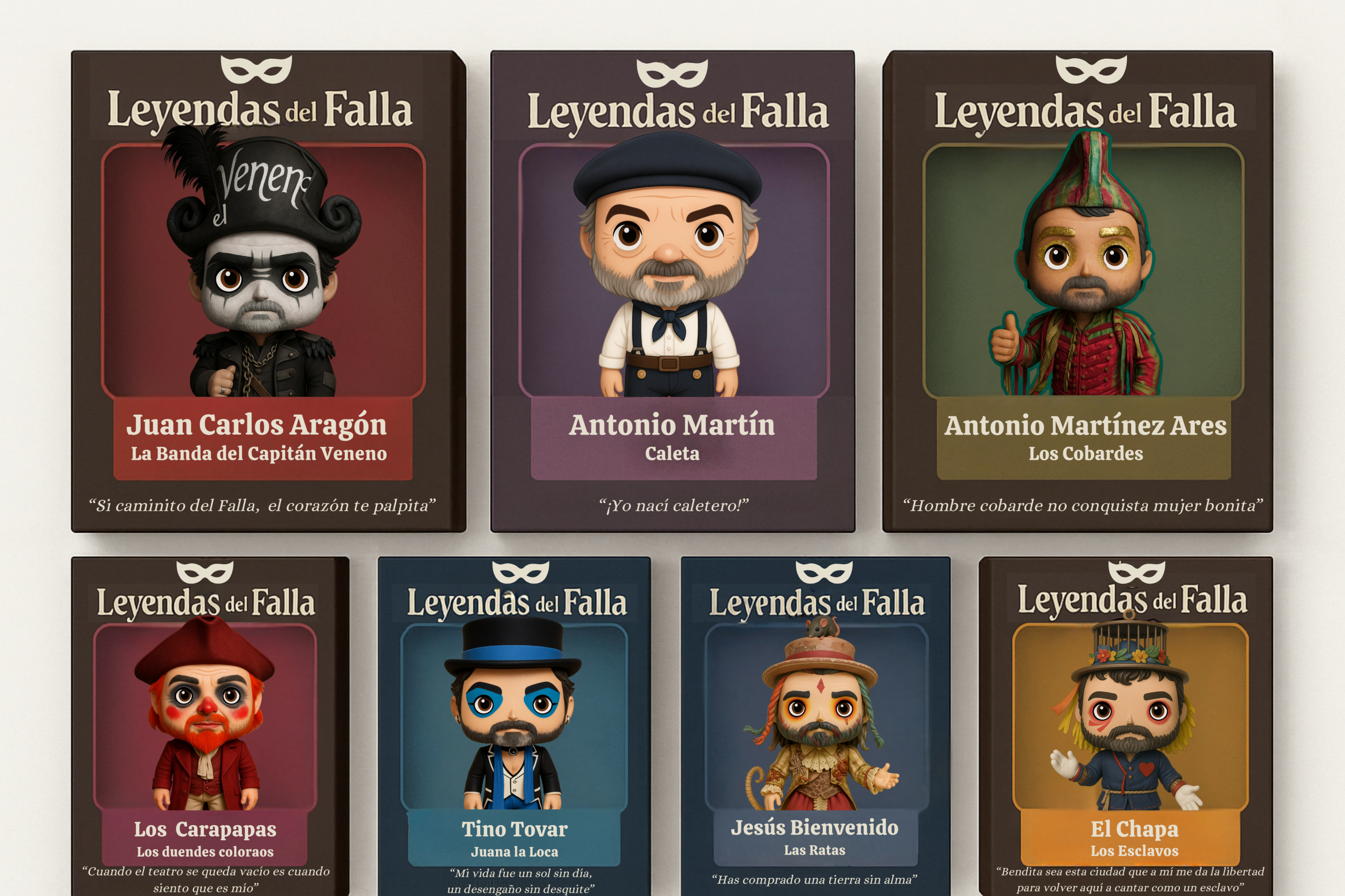 Llévate las comparsas de la COLECCIÓN «Leyendas del Falla» con 7 figuras únicas de las comparsas más emblemáticas del Carnaval de Cádiz. Cada figura está elaborada artesanalmente en metacrilato impreso a todo color, con base negra y su caja personalizada con nombre, autor y frase mítica.