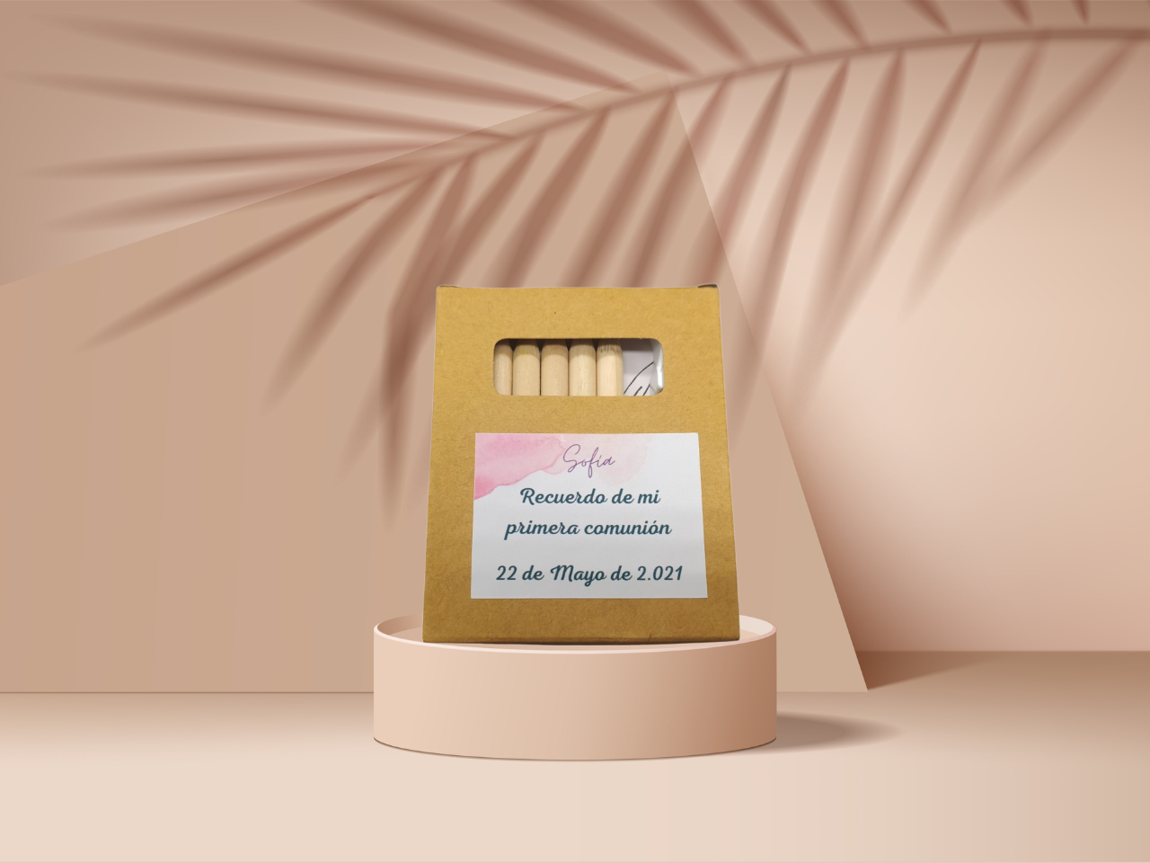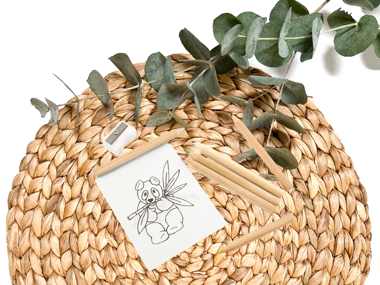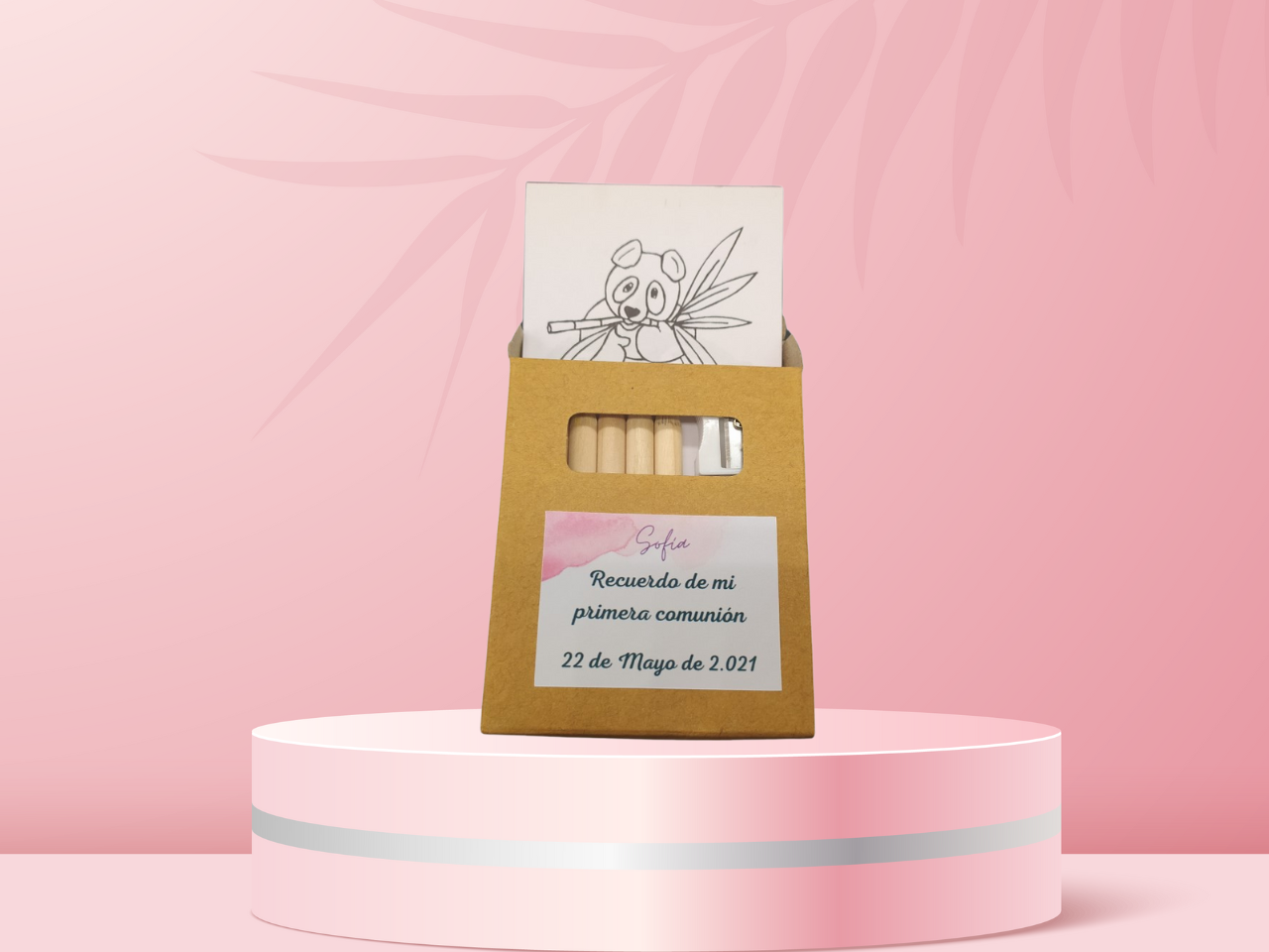Detalle cajita lápices con diseño personalizado, contiene: 6 lápices, sacapuntas y bloc con 20 hojas para colorear.