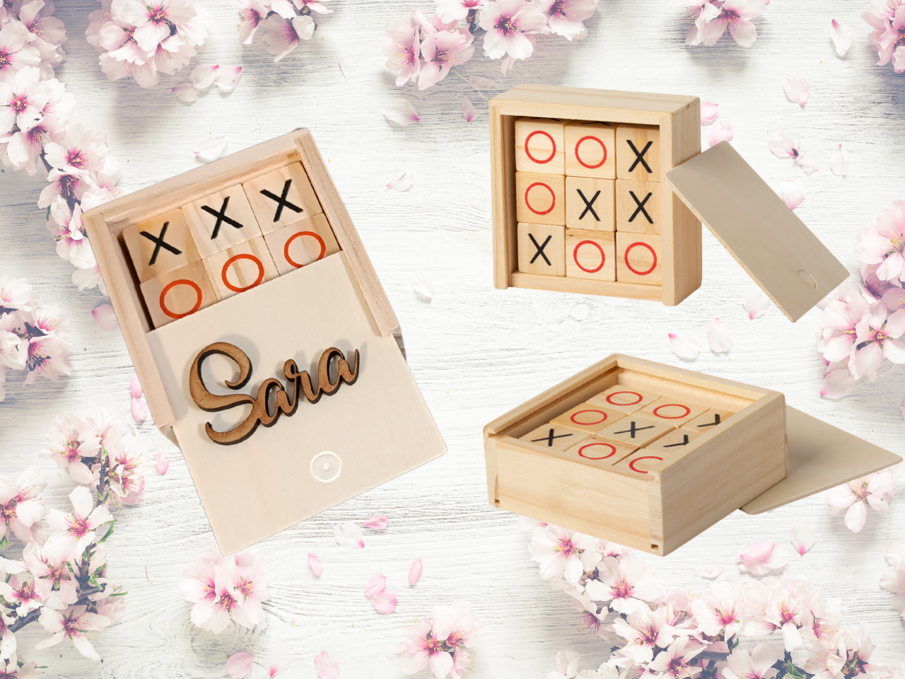 Clásico juego 3 en raya presentado en cajita de madera cuya tapa tiene la posibilidad de personalizar en varios formatos: