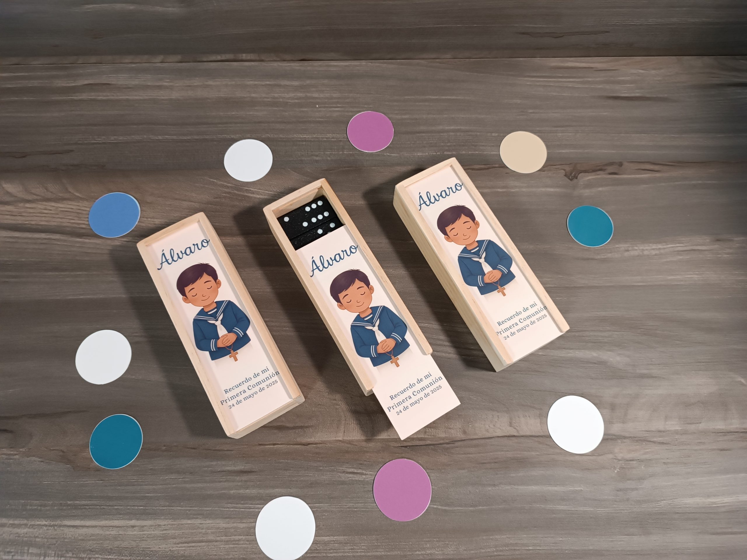 Sorprende a los más pequeños en cualquier ocasión especial con nuestro dominó infantil personalizado con nombre para comuniones, bautizos, bodas y otros eventos. Fabricado en madera y decorado con adorables animalitos, este dominó se puede personalizar con el nombre del protagonista o de cada invitado, convirtiéndolo en un detalle único. Es un regalo original que les mantendrá entretenidos durante la celebración.