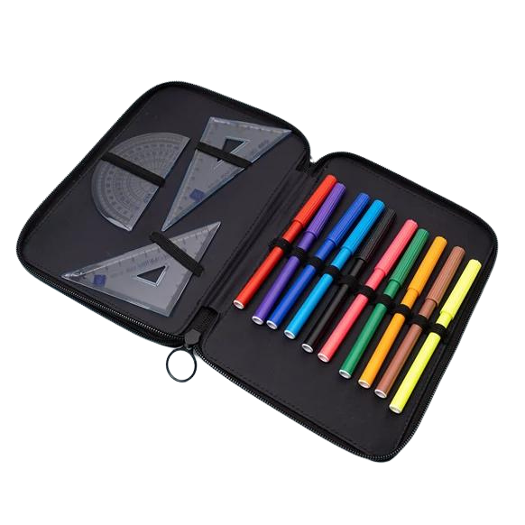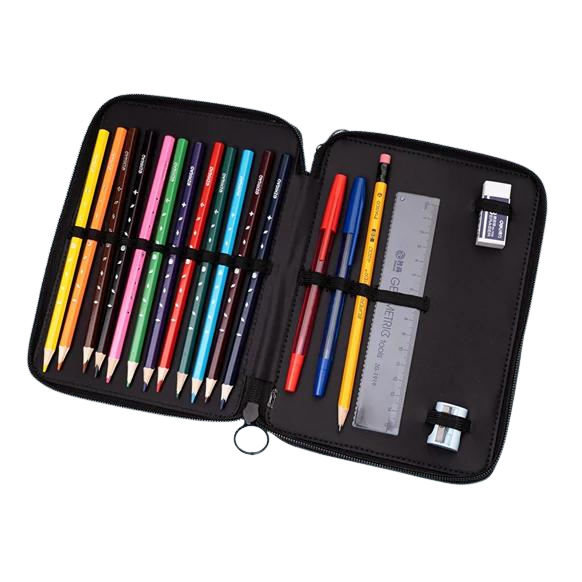 El estuche tiene 2 compartimentos con material escolar incluido: