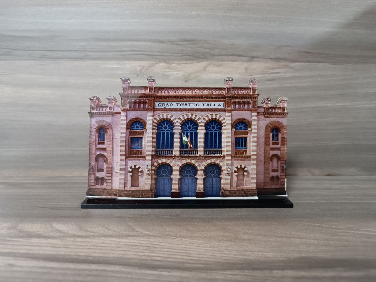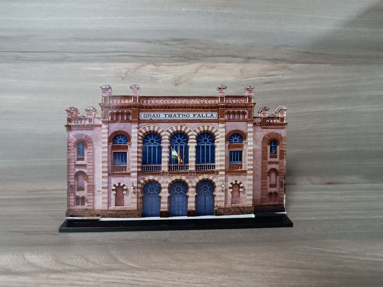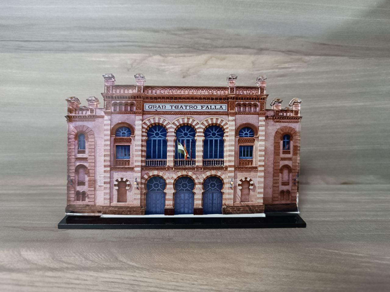 Se trata de una réplica artesanal del Gran Teatro Falla, elaborada en metacrilato a color para lograr un efecto tridimensional. Incluye una pequeña base negra.