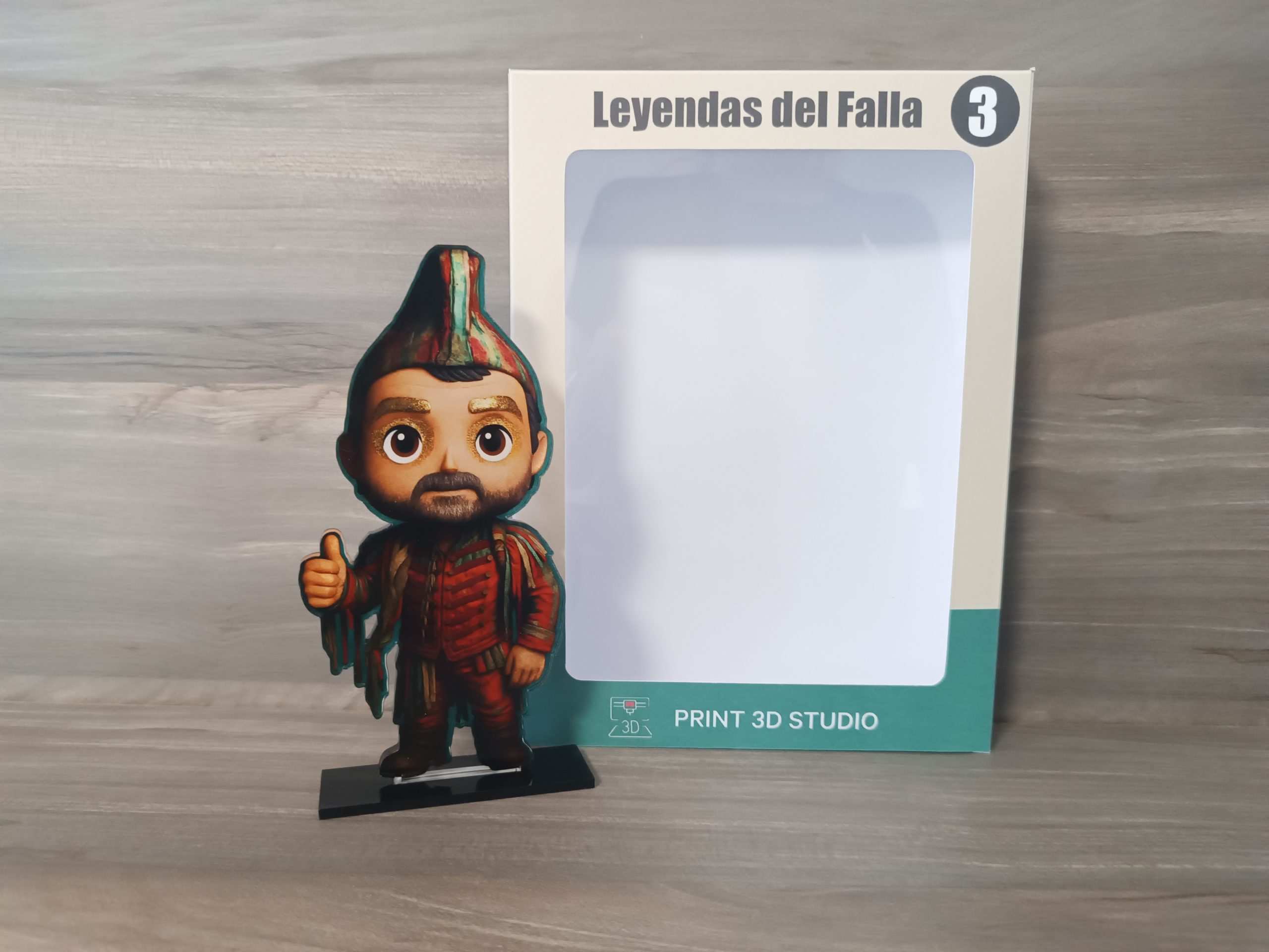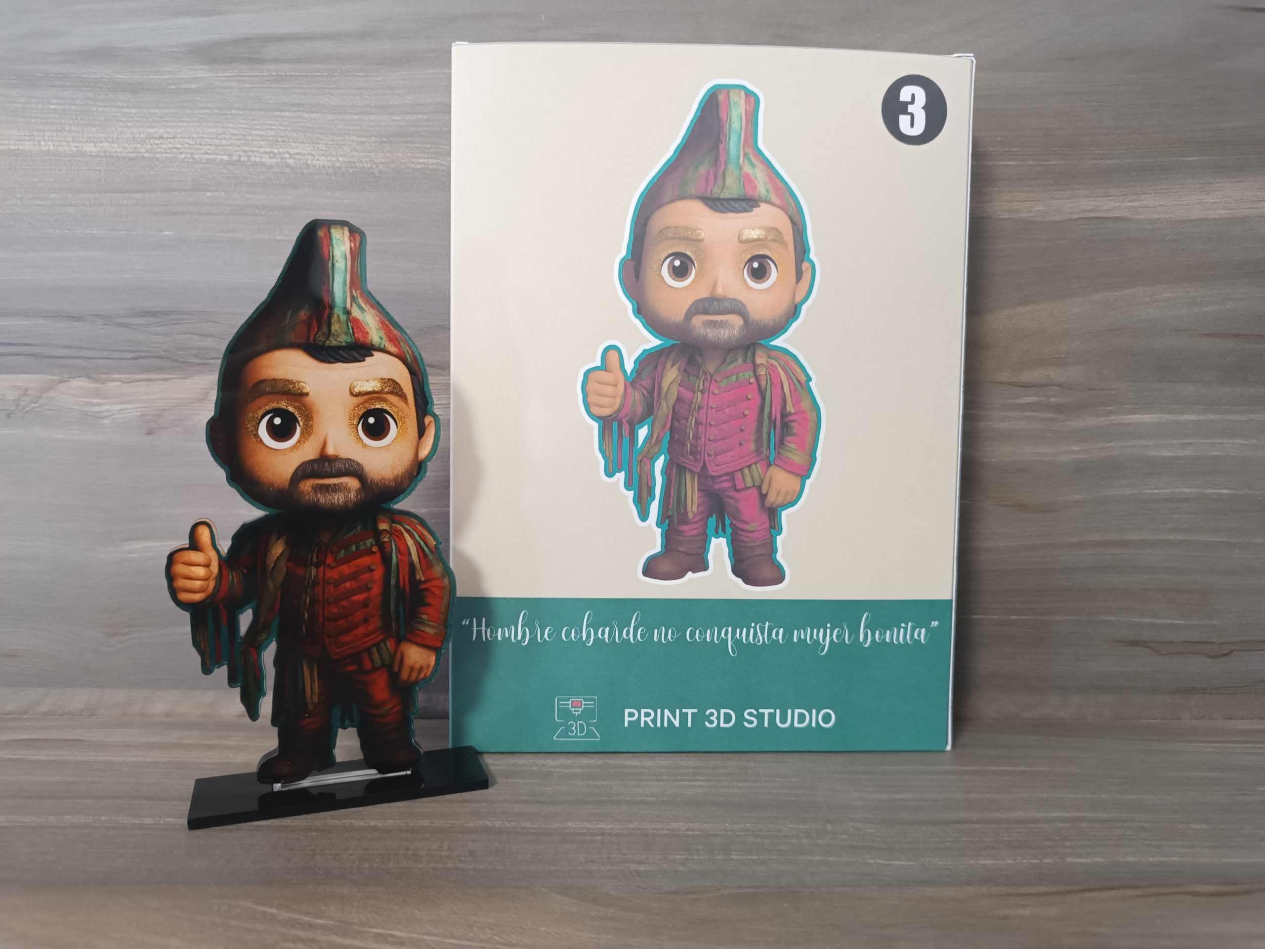 Cada figura está elaborada en metacrilato impreso a todo color, con base negra y una caja personalizada que incluye el nombre de la agrupación y una frase mítica del carnaval.