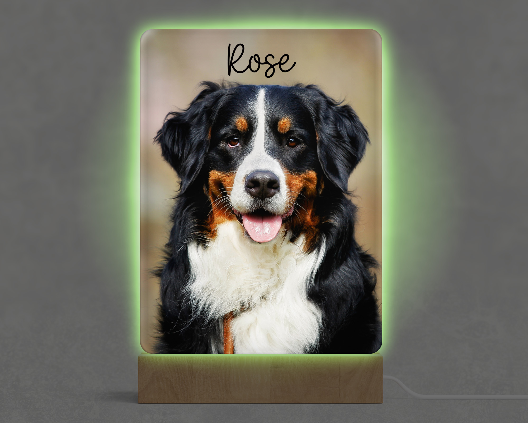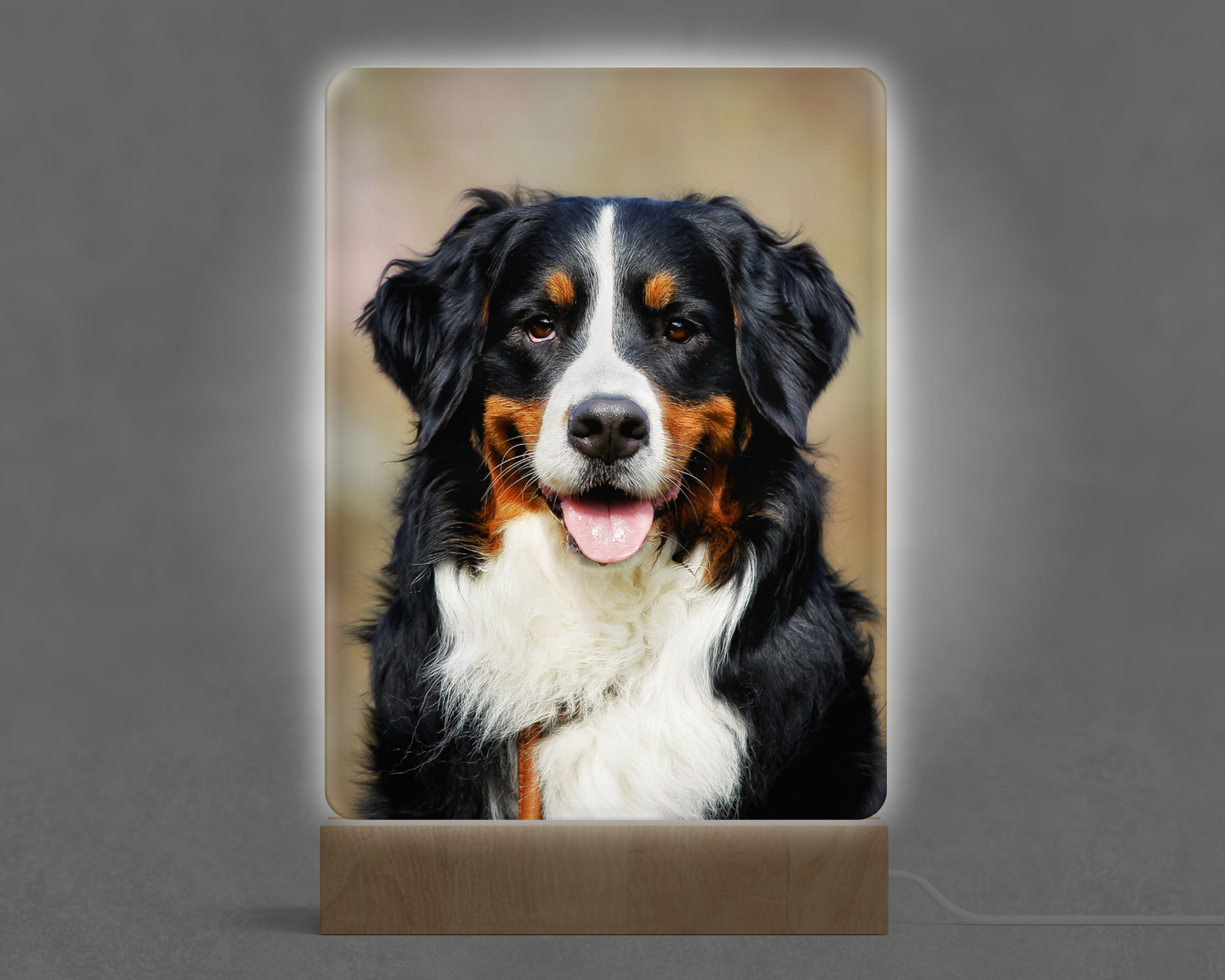 Haz brillar el amor por tu peludo con esta lámpara LED personalizada en metacrilato con impresión a todo color. Capturamos la esencia de tu mascota a partir de una foto y la plasmamos sobre una placa acrílica, acompañada de su nombre.