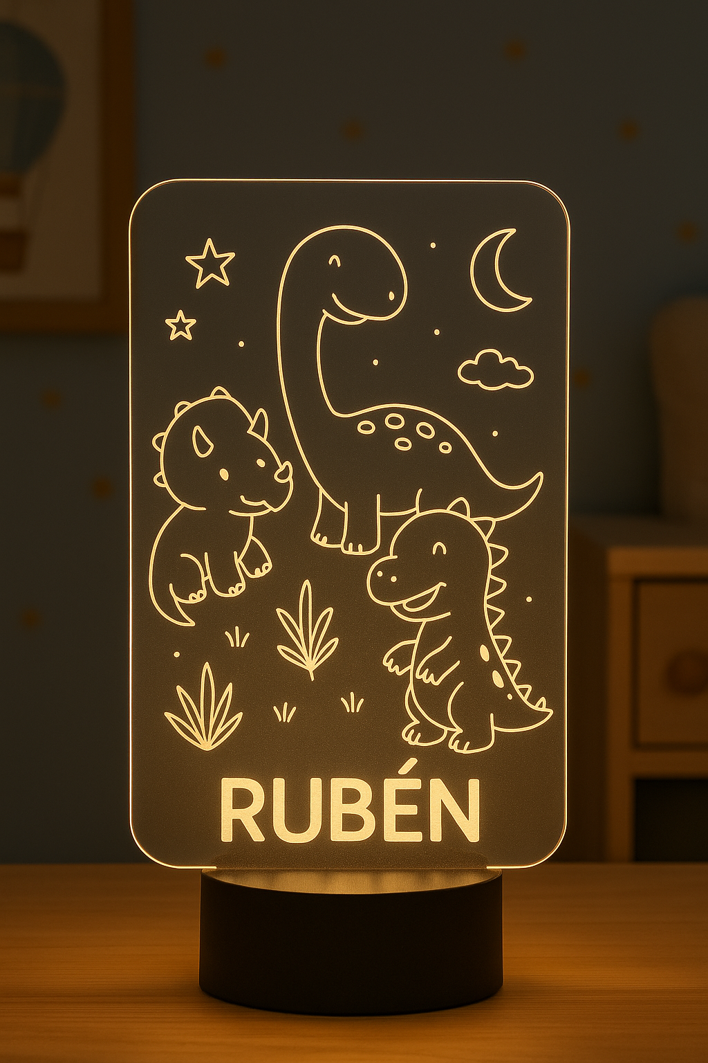• Lámpara LED personalizada: Fabricada en metacrilato impreso a todo color, ideal para su mesita de noche.